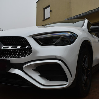 W tym przypadku nowy Mercedes GLA z fabrycznie czarnego koloru oklejony w białą perłę.